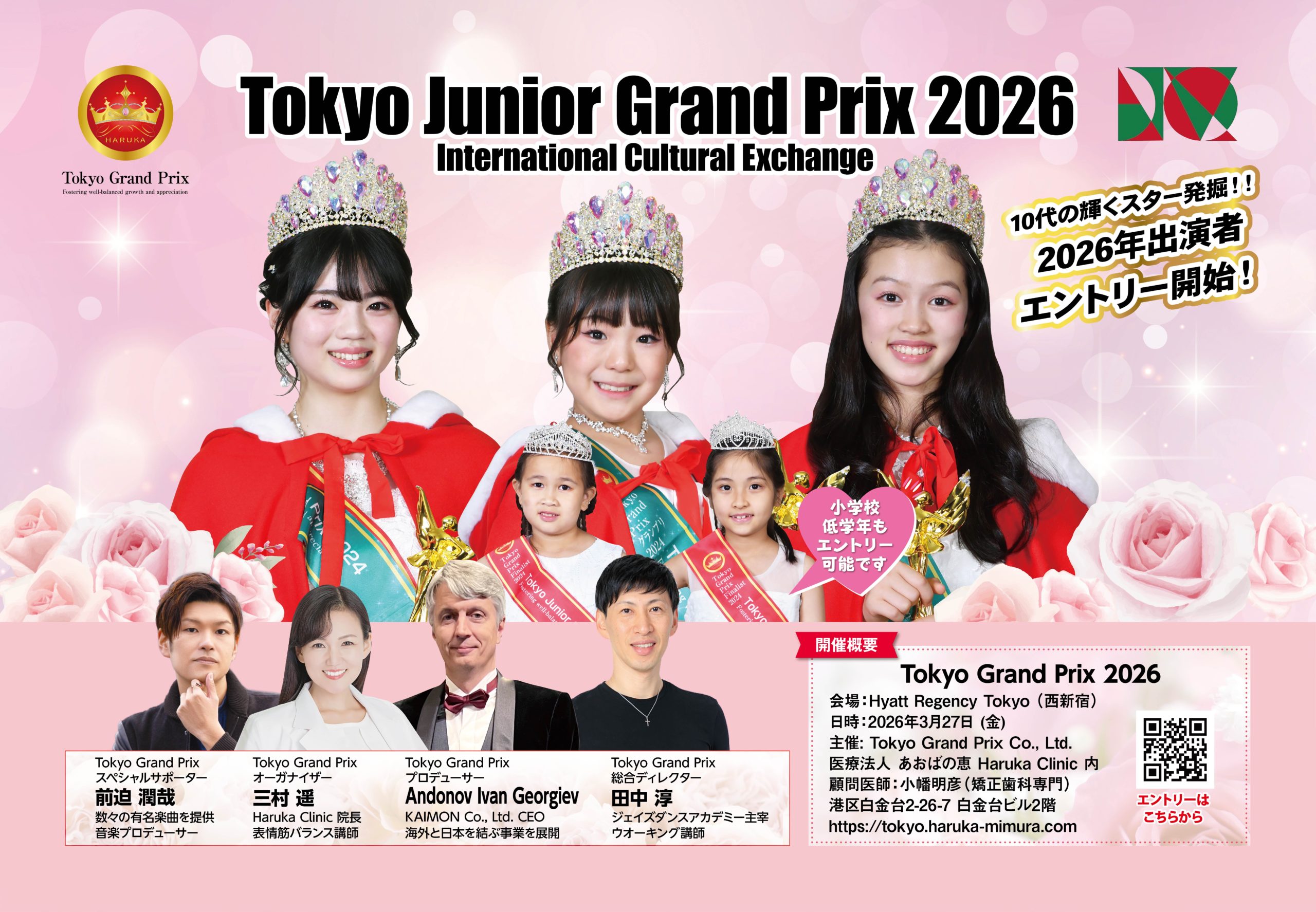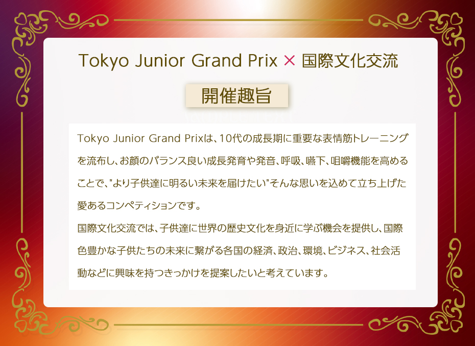 The "Tokyo Grand Prix" is a competition full of love run by the director of the medical corporation "Aoba no Megumi," based in Minato-ku, Tokyo, to provide health education to children. We hold the Tokyo Junior Grand Prix annually, welcoming participants of any nationality. As a platform for the international activities of Tokyo Grand Prix finalists, the event has received participation confirmations from embassies of over 10 countries, and an international cultural exchange party is held on the same day as the Tokyo Grand Prix.Additionally, we ask past finalists to guest appear and help with reception and guidance. In organizing this event, we aim to focus on one of the SDGs: Good Health and Well-Being. Through the event, we hope to share our medical knowledge, enhance physical balance in a healthy and beautiful way, help fulfill dreams, and take a step toward a bright future. Furthermore, the sponsors, producers, directors, lecturers, and staff of the Tokyo Grand Prix are all warm-hearted individuals who cooperate with a spirit of volunteerism for the sake of the children. The organizer, Haruka Mimura, is the director of the facial muscle balance clinic and a mother, and wishes to provide children, who will create a bright future, with loving memories. We look forward to entries or re-entries from parents of teenagers nationwide for the Tokyo Grand Prix.