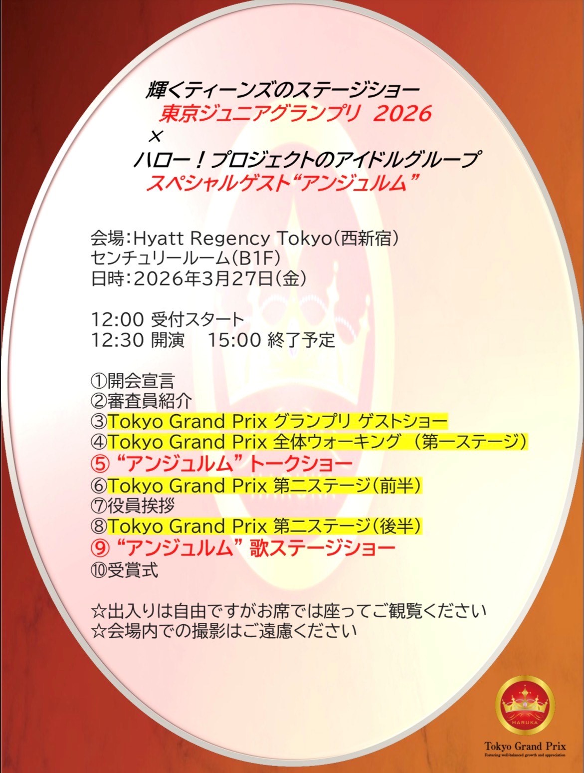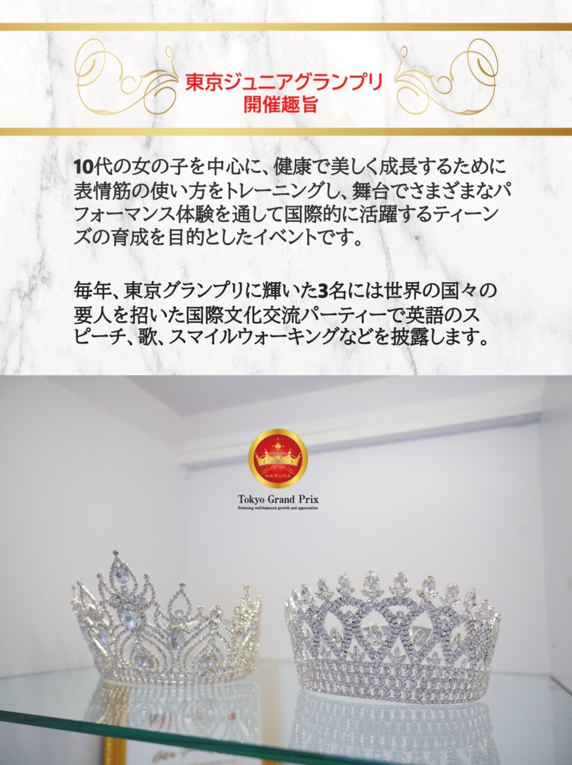 『Tokyo Grand Prix 』は東京都港区に拠点を構える"医療法人あおばの恵"院長が運営する健康教育を子供たちに提供する愛情いっぱいのコンペティションです。国籍を問わず参加いただける Tokyo Junior Grand Prix を毎年開催しています。Tokyo Grand Prixファイナリストの方々の国際的な活躍の場として開催イベントには10カ国以上の大使館から参加表明を頂き国際文化交流パーティーをTokyo Grand Prixと同日開催しています。またゲスト出演や受付案内のお仕事を歴代ファイナリストの方々にお願いしています。 本イベントを運営するにあたりSDGsの一つである健康と福祉をテーマにしたいと考えております。私どもの医学的知識をお伝えし健康に美しく身体のバランスをより高めることで夢を叶え、そして明るい未来へ続く一歩になればという想いで開催します。 またTokyo Grand Prixスポンサー、プロデューサーやディレクター、講師、スタッフはみな子供たちのためにボランティア精神で協力して下さるあたたかい方ばかりです。 主催者 三村遥は表情筋バランスクリニックの院長であり母親でもありこれから輝く未来を創る子供たちに愛情いっぱいの思い出を提供したいと考えています。全国の10代のお子様をもつ親御さん 是非Tokyo Grand Prixへのエントリー、再エントリーお待ちしています。